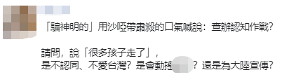 還有網友問蘇貞昌,“説‘很多孩子走了’,是不認同、不愛台灣?……還是為大陸宣傳?” ↓