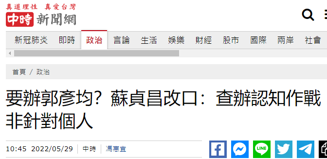“中時新聞網”報道稱,蘇貞昌今日受訪時宣稱,台灣身處在“認知作戰”的最前線,做好防疫,保護孩子、民眾的健康,與保護台灣社會安定同等重要,對於病毒、對於資訊戰都不能鬆懈。他還聲稱,有任何生命消逝,我們都感到非常難過、不捨,但對於任何有危社會安定的侵害,也絕不能掉以輕心,這由權責機關依法公正辦理就好,並不是針對任何個人。