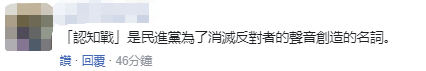 也有網友諷刺蘇貞昌所謂“認知作戰”的説法,稱“‘認知戰’是民進黨為了消滅反對者的聲音創造的名詞”。↓