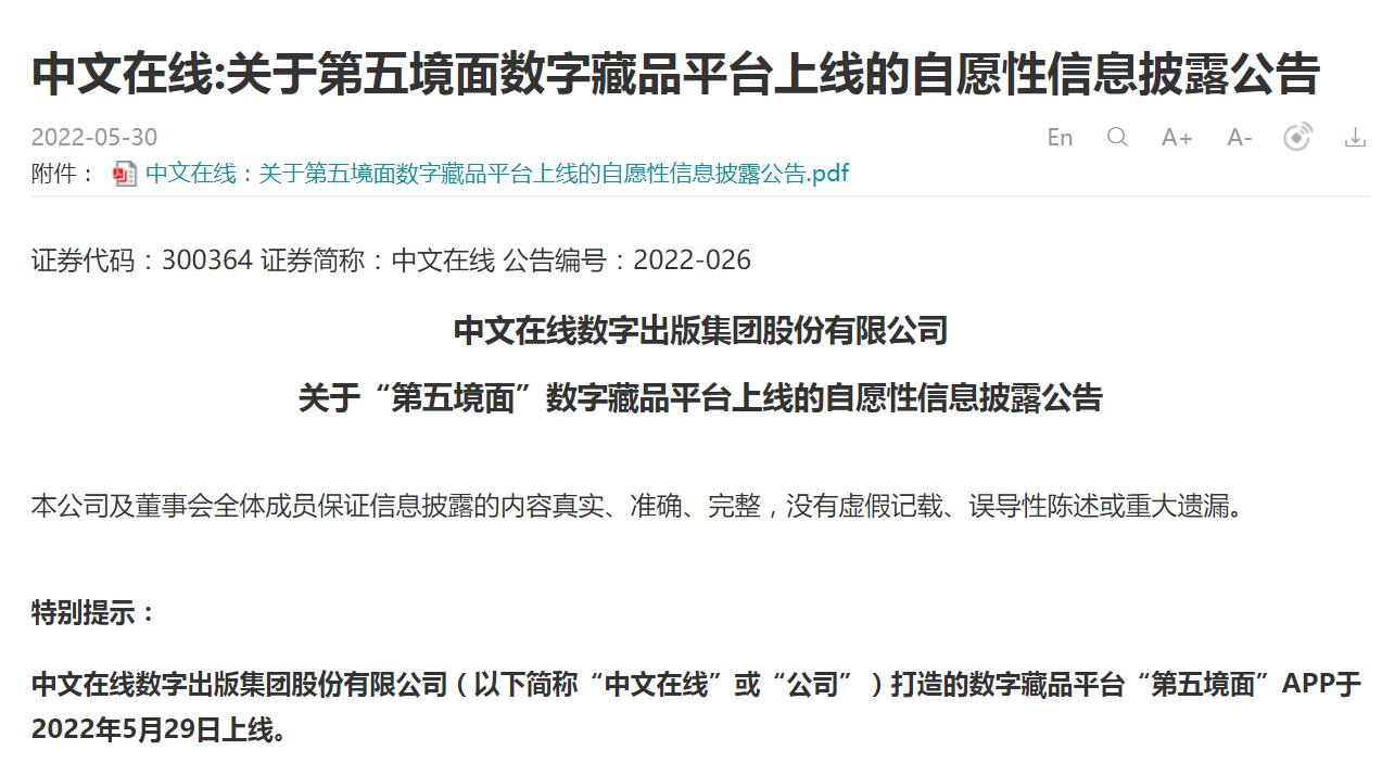 【環球網綜合訊】5月30日消息,中文在線公告顯示,公司打造的數字藏品平台“第五境面”APP於5月29日上線;“第五境面”是公司面向元宇宙的第一個數字藏品平台。