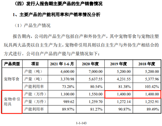 源飛寵物主要產品是寵物牽引用具招股説明書稱,報告期內,公司的產品生產包括自產和外協生產,其中寵物零食與寵物注塑玩具兩大品類以自主生產為主,寵物牽引用具則以自主生產與外協生產相結合的方式進行。2018年、2019年,發行人寵物牽引用具產能均為1400萬件,2020年增至1550萬件。