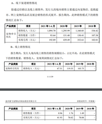 源飛寵物招股書還披露了公司境內線上線下銷售的營收數據。其中寵物牽引用具線下渠道2019年銷售1160.05萬元,銷量150.41萬件,平均單價僅7.71元/件,但線上渠道2019年銷售103.75萬元,銷量1.76萬件,平均單價高達59元/件,是線下銷售單價的近8倍。