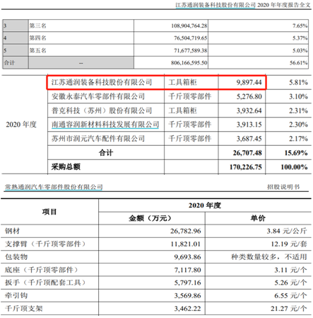另據招股書披露常潤股份在2020年向通潤裝備和“普克科技(蘇州)股份有限公司”採購的均是工具箱櫃,合計金額達1.38億元,但與此同時在招股書披露的主要原材料採購信息中,第一大采購項目為鋼材、對應金額26782.96萬元,第二大采購項目為支撐臂(千斤頂零部件)、對應金額11821.01萬元。