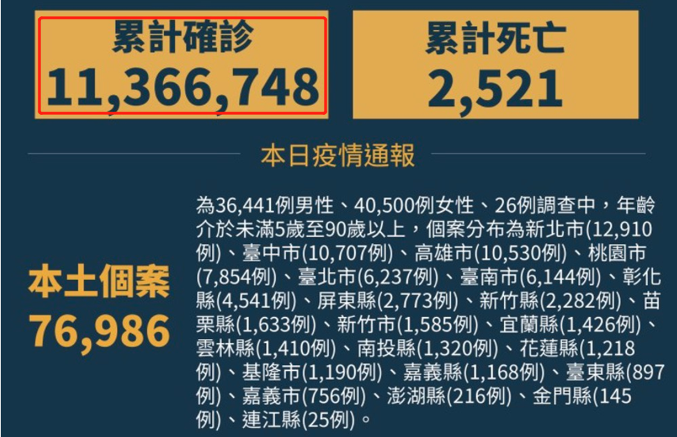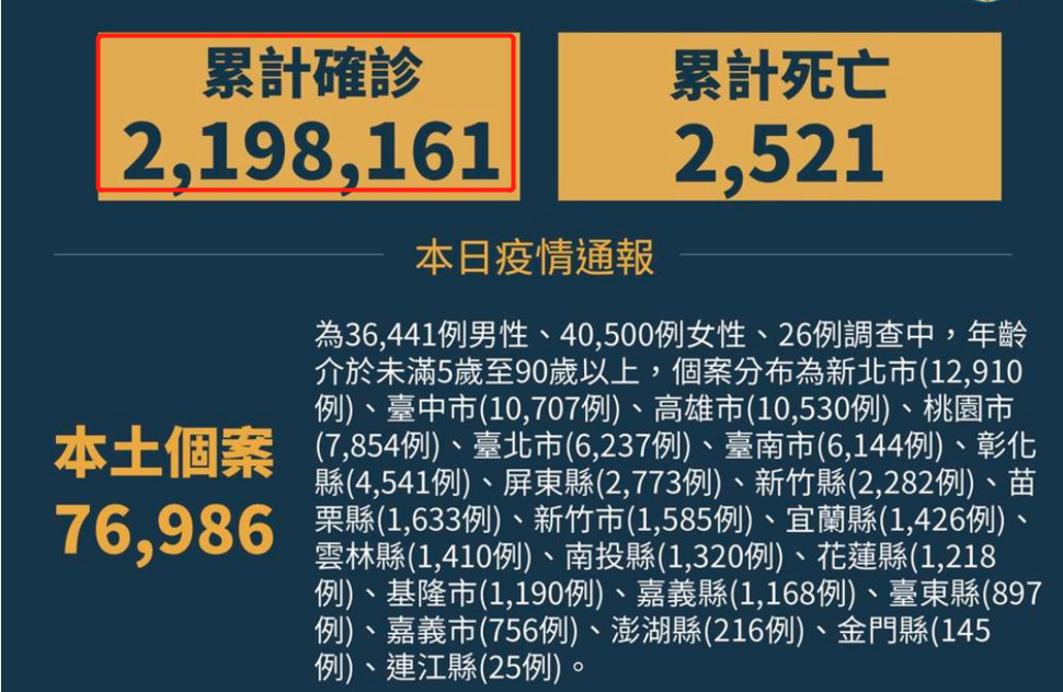 台灣流行疫情指揮中心今天(2日)公佈,台灣新增76986例新冠確診病例,分別為76967例本土病例及19例境外輸入病例。另外,確診病例中新增144例死亡病例。指揮中心統計,截至目前,台灣新冠確診病例累計達2198161例,其中包括13051例境外輸入、2185056例本土病例;2020年起,台灣新冠死亡病例累計達2521例。