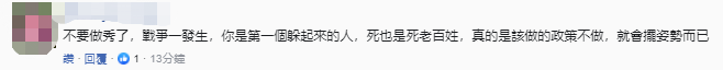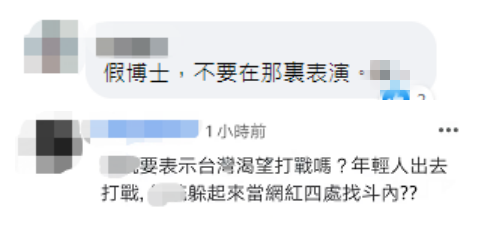 還有人向蔡英文喊話,“不要在那裏表演”;“要表示台灣渴望打仗嗎?年輕人出去打仗,蔡英文躲起來當網紅四處找鬥內(指贊助)?” ↓