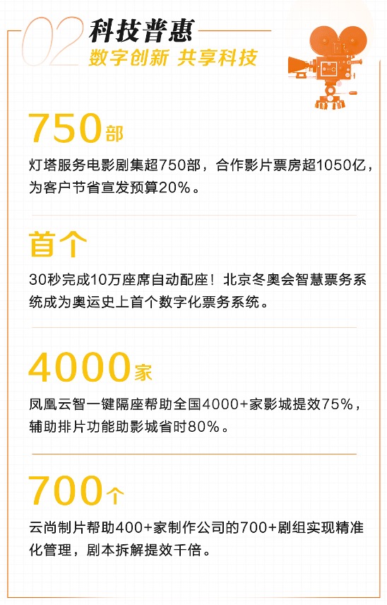 科技方面,阿里影業和大麥因地制宜、多點發力,持續助力產業提效、共享科技普惠。燈塔數字宣發平台不斷以產品力和數據力推動泛文娛行業數智化和標準化建設,累計服務電影劇集超750部,為客户節省宣發預算20%;鳳凰雲智一鍵隔座幫助全國4000餘家影城提效75%,輔助排片功能助力影城省時80%;雲尚製片深耕影視製作工業化系統建設,助力700餘劇組實現精準化降本管理,劇本拆解提效千倍。