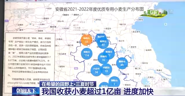 在安徽渦陽,187萬畝小麥正加緊收穫。一張小麥地圖,讓種糧大户宋來寶的3000畝優質強筋小麥賣上了優價。