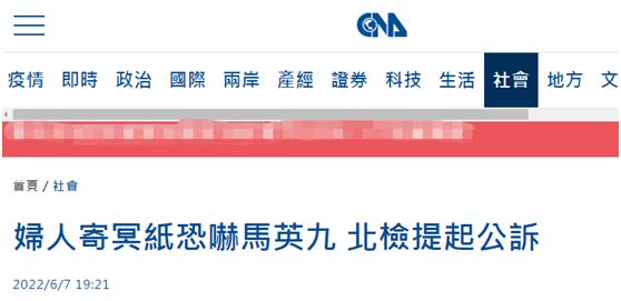 【環球網報道】據台灣“中央社”報道,台灣地區前領導人馬英九辦公室此前接連收到銀行本票、內附冥紙的恐嚇信,檢方及警方依郵票上唾液DNA比對,認定許姓女子涉案,台北地檢署今天(7日)依恐嚇等罪起訴許姓女子。