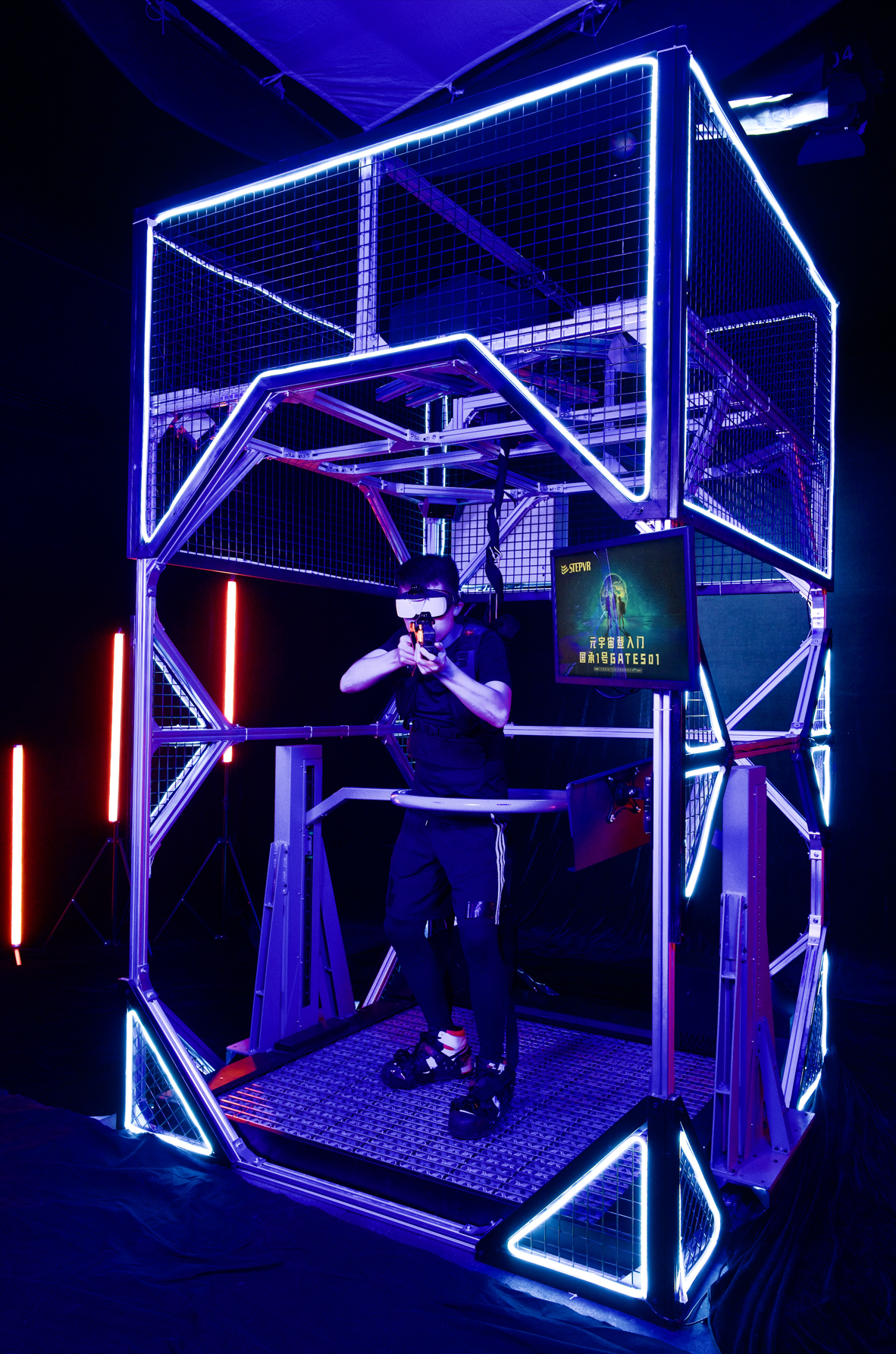 通過一台由PC頭顯、動捕手套、震動馬甲和全向運動系統組成的“機器”,在3平米的空間內可以真實還原用户的視覺、聽覺、嗅覺和前庭感覺,用户可以360度自由地移動起來,CS、吃雞等爆款手遊都可以遷移過來,而且支持Steam VR上70%需要移動的遊戲。