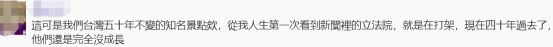 還有網友諷刺道,“這可是我們台灣五十年不變的知名景點,從我人生第一次看到新聞裏的‘立法院’,就是在打架,現在四十年過去了,他們還是完全沒成長。”↓