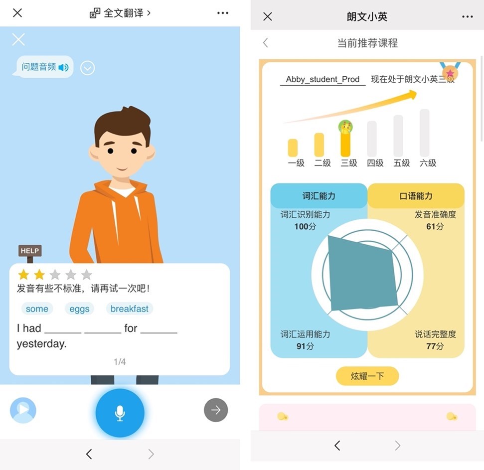在《新朗文小學英語》產品中,常規的英語練習配合語音評測,為學生提供了更多的語言練習機會和快速準確的效果反饋。學生在朗讀學習內容後,語音評測就會對發音準確度、完整度等幾個方面做出評分並生成可視化圖表。這既能讓學生了解自己的朗讀表現,也能幫助教師們一目瞭然地掌握每個學生的學習進度,無需耗費過多精力也能對每個學生進行高效的分析評估及後續指導。