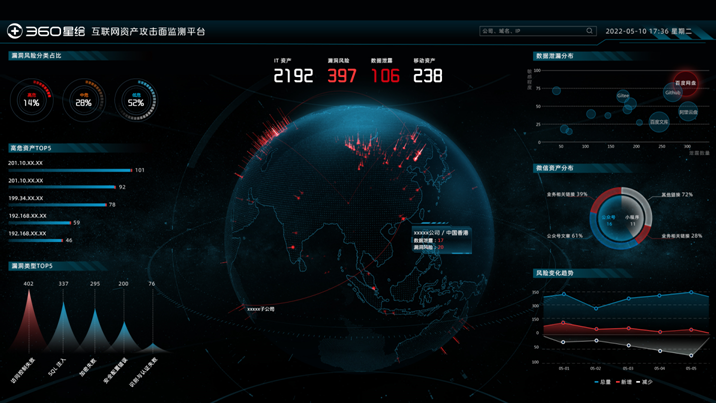 一是具備了全維視角的資產排查能力。360星繪基於360雲端安全大腦EB級數據情報賦能,擁有着覆蓋面足夠廣、精確度足夠高的資產摸排能力,能夠以傳統IT資產、移動資產、數據資產三大維度梳理互聯網資產並明確歸屬,有效幫助政企機構全方位掌握互聯網暴露的攻擊面,監測可能被攻擊者利用的安全風險,及時採取措施修復加固。