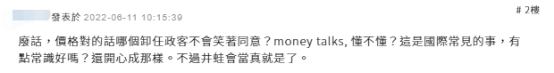 但一些島內網友不以為然,在台媒評論區留言説,“價格對的話哪個卸任政客不會笑着同意?” “這是國際常見的事,有點常識好嗎?還開心成那樣。不過井蛙會當真就是了。” ↓