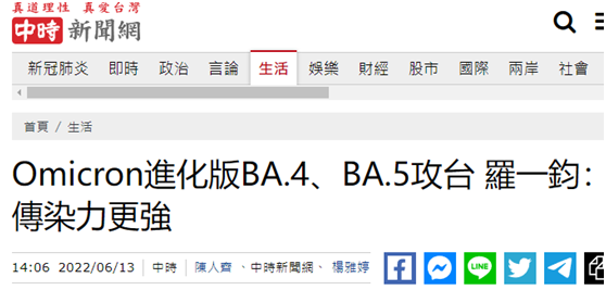 台媒:台灣首次發現奧密克戎亞型毒株BA.4和BA.5病例