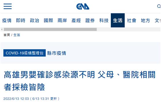 【環球網報道】據台灣“中央社”報道,高雄一名6日出生的男嬰確診新冠,但父母都未染疫。協助生產的高雄聖功醫院今天(13日)稱,相關工作人員快篩、PCR核酸採檢都是陰性,男嬰目前感染源仍不明。