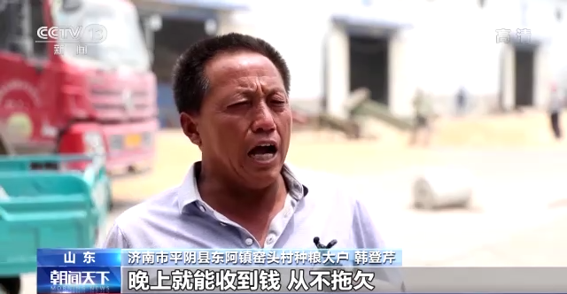 *濟南市平陰縣東阿鎮窯頭村種糧大户 韓登芹:*今年我種了110畝麥子,平均(每畝產量)是1200到1300斤,今年能收入10萬多塊錢。這裏有結算平台,晚上就能收到錢,從不拖欠。