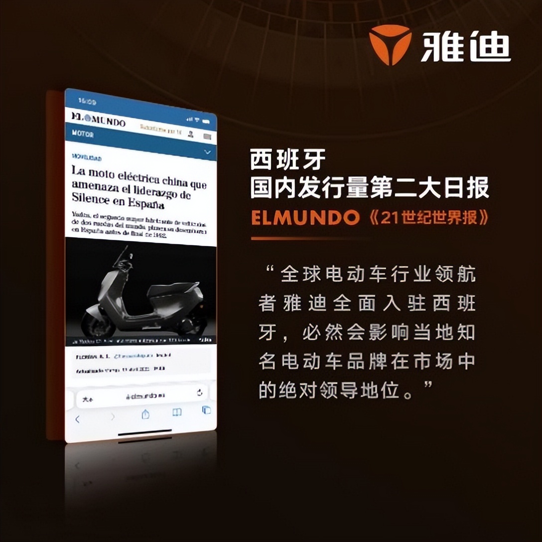 “天時、地利、人和,三者不得,雖勝有殃。”這句話或許道出了我國企業出海發展的心聲。面對國內市場日益激烈的競爭,將業務拓展至海外走全球化發展路線,不僅能夠為企業帶來新的發展增量,也成為企業品牌破“內卷”的重要途徑之一。日前,關於“全球兩輪電動車巨頭即將全面入駐西班牙市場”的消息引發了大量海內外媒體以及產業界的關注,並紛紛將目光對準了全球兩輪電動車品牌雅迪。