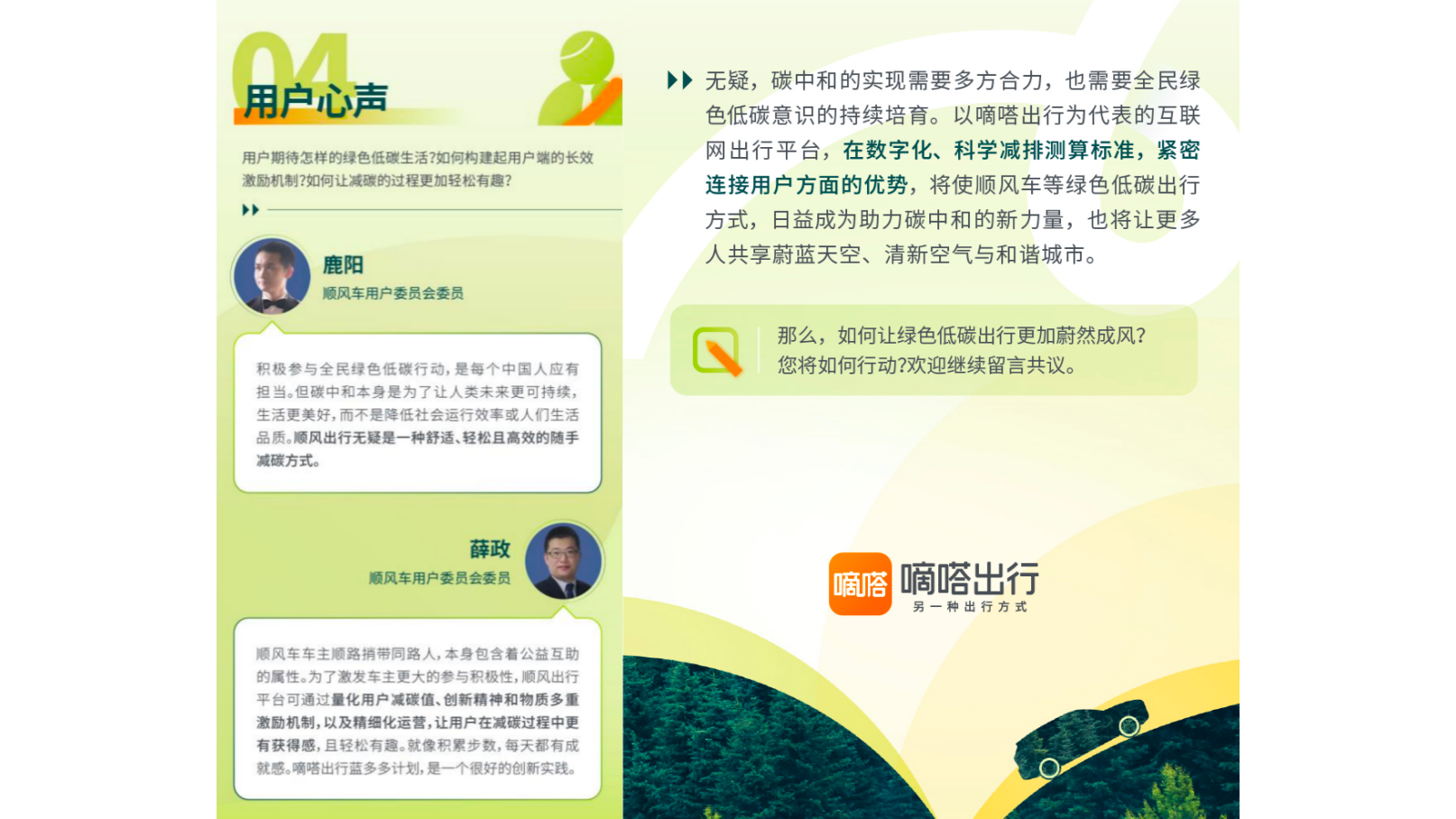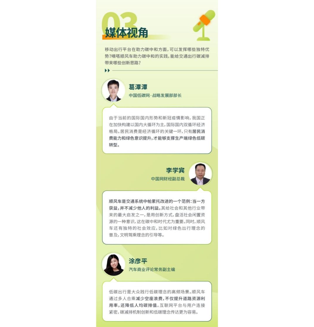 “在數字經濟時代,各種線上化手段和共享模式,使很多事情都可以用更低碳方式來實現。以順風車為代表的低碳出行,在宏觀層面符合國家碳中和戰略,符合國際社會主流方向,是踐行全民綠色低碳的小切口,切實可行且普適。”