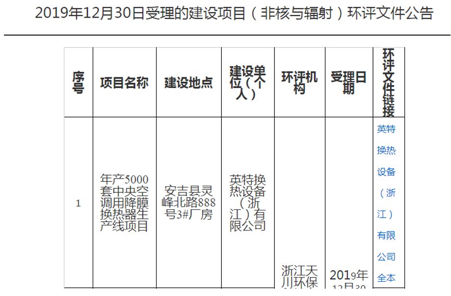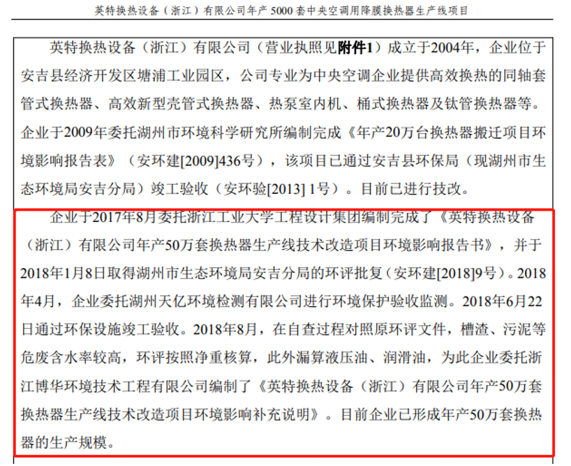 但是英特科技所在地安吉縣人民政府在其網站發佈了2019年12月30日受理的《英特換熱設備(浙江)有限公司年產5000套中央空調用降膜換熱器生產線項目》環評文件。上述文件顯示:英特換熱設備(浙江)有限公司於2009年委託湖州市環境科學研究所編制完成《年產20萬台換熱器搬遷項目環境影響報告表》(位於塘浦工業園區)並於2009年取得安吉縣環保局(現湖州市生態環境局安吉分局)環評批覆(安環建[2018]9號),該項目已通過安吉縣環保局(現湖州市生態環境局安吉分局)竣工驗收(安環驗[2013]1號)。2017年在原廠區已進行技改,並於2017年8月委託浙江工業大學工程設計集團編制完成了《英特換熱設備(浙江)有限公司年產50萬套換熱器生產線技術改造項目環境影響報告書》(位於塘浦工業園區,距離本項目約11km)於2018年1月8日取得湖州市生態環境局安吉分局的環評批覆(安環建[2018]9號)。該項目2018年6月22日已通過自主驗收。目前已形成年產50萬套換熱器的生產能力,廠區繼續運行。