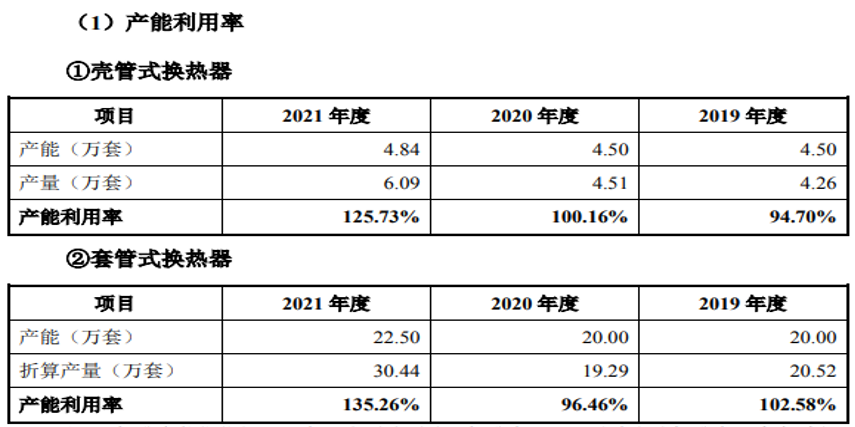 英特科技稱,公司產能已趨於飽和。隨着近年來換熱器在供暖、熱水、製冷、工農業生產等領域的快速發展,根據公司近年訂單的簽訂和與客户接洽情況,合理預計公司未來銷量仍會快速增長。因此,英特科技稱,公司亟需通過建設新的生產基地進行合理佈局,同時配套先進的生產和檢測設備,從而提高公司生產效率和綜合實力,以滿足換熱器下游市場不斷增長的需求,全面提升公司綜合競爭力。此次公司在創業板上市,計劃募集資金投資項目之一就是進一步擴大產能,建設年產17萬套高效換熱器生產基地。
