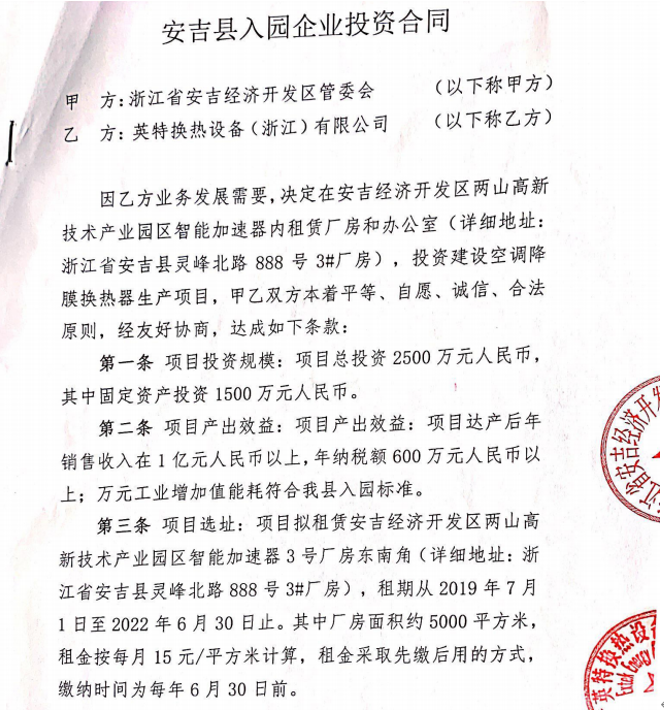 除了產能數據與安吉縣人民政府公告內容存在差異外,本網記者還發現,2019年6月10日,英特科技與安吉經濟開發區管委會簽署安吉縣入園企業投資合同,約定安吉經濟開發區管委會以每月15元/平的低價向英特科技出租5000平廠房。對應的條件是要求英特科技項目總投資2500萬元人民幣,其中固定資產投資1500萬元人民幣,項目達產後年銷售收入1億元以上,納税額600萬元以上。項目預計投產日期為2020年2月。