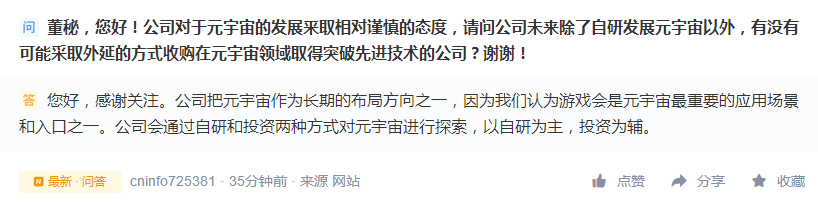 事實上,2021年公司研發費用同比減少1.06%。公司對此作出解釋,是優化研發人員結構和增加對在研產品投入等多種因素綜合作用的結果,這其中有增項、有減項,和公司的整體戰略執行並不衝突。對元宇宙的投入也是循序漸進的,公司研發費用佔營收比例將保持相對穩定。