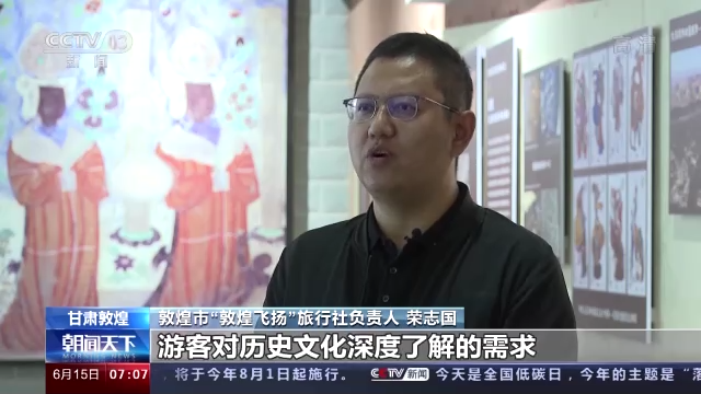 *敦煌市“敦煌飛揚”旅行社負責人 榮志國:*但是博物館現有的公益講解,完全滿足不了遊客對歷史文化深度瞭解的需求。我們就在想打造這樣一款深度講解的產品。