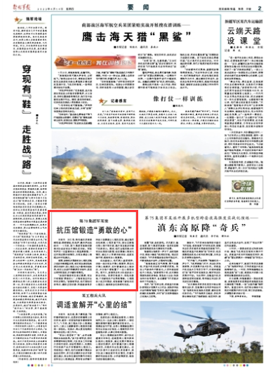 解放軍報訊 劉仁浩、特約通訊員高駿峯報道:硝煙頓起,槍炮聲、爆炸聲此起彼伏……5月底,第71集團軍某旅偵察集訓隊組織官兵開展抗壓訓練。軍醫李聲權一邊查看官兵心理監測數據,一邊對照近期訓練情況,為官兵調適心理提出針對性建議。