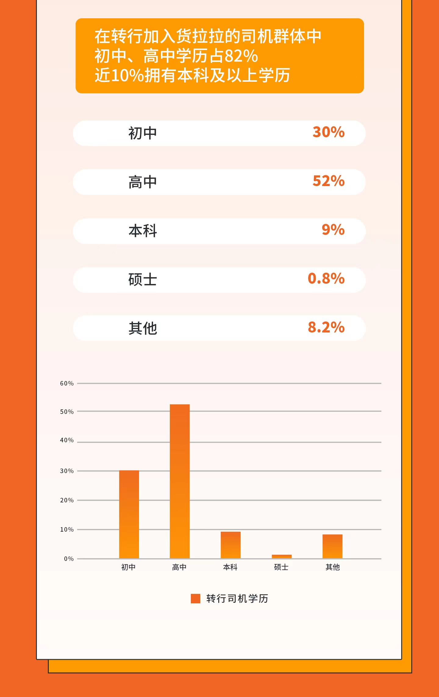 貨拉拉司機問卷樣本顯示,這些司機羣體中初中、高中學歷佔82%,其中大多數為高中學歷,近10%擁有本科及以上學歷。