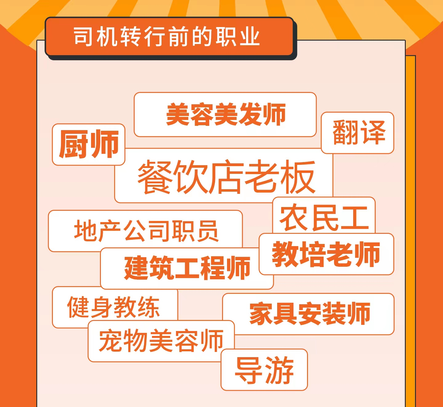 在800多位轉行加入貨拉拉的司機中,他們曾是餐飲店老闆、導遊、美容美髮師、地產公司職員、教培老師等各個行業的從業者,其中餐飲和旅遊行業的從業者最多,有50多位司機曾是餐飲個體户或廚師,近30位司機曾是導遊。