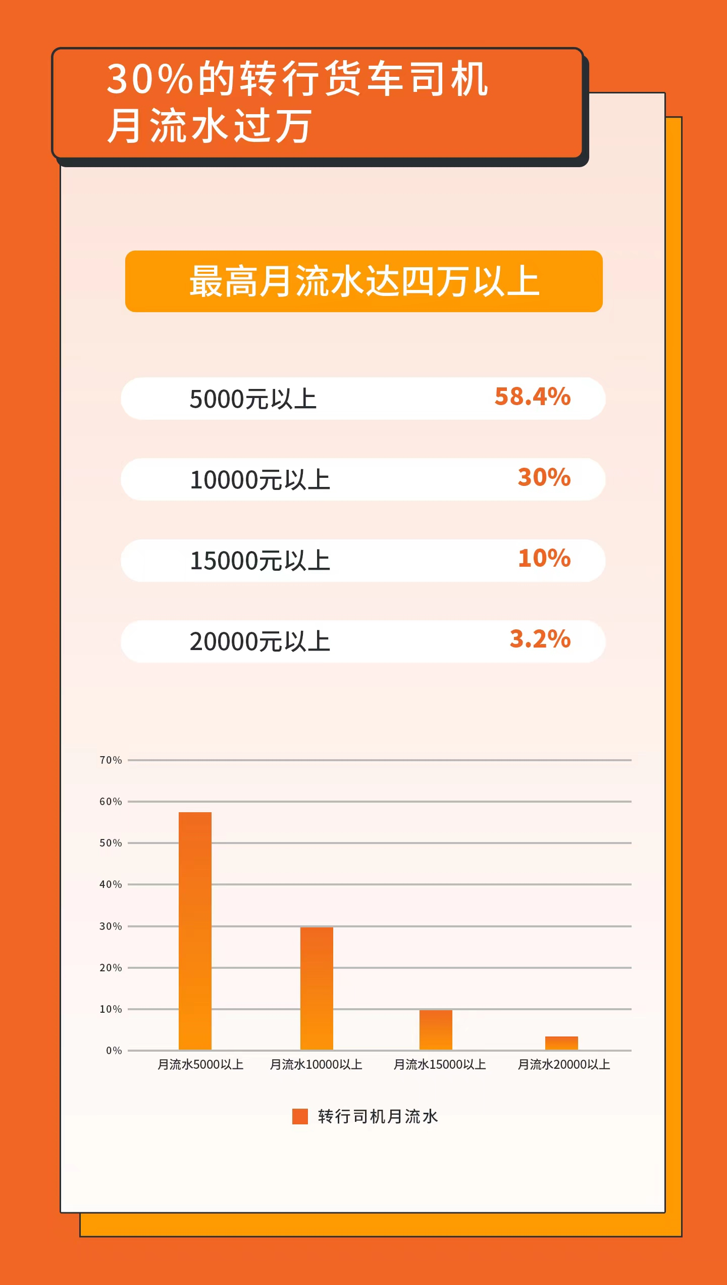 貨拉拉數據顯示,在這800多位轉行的司機樣本調研中,月均流水5000元以上佔據58.4%左右,月均流水過萬的佔30%,月均流水在15000 元以上的10%,月均流水在20000的以上的佔3.2%。
