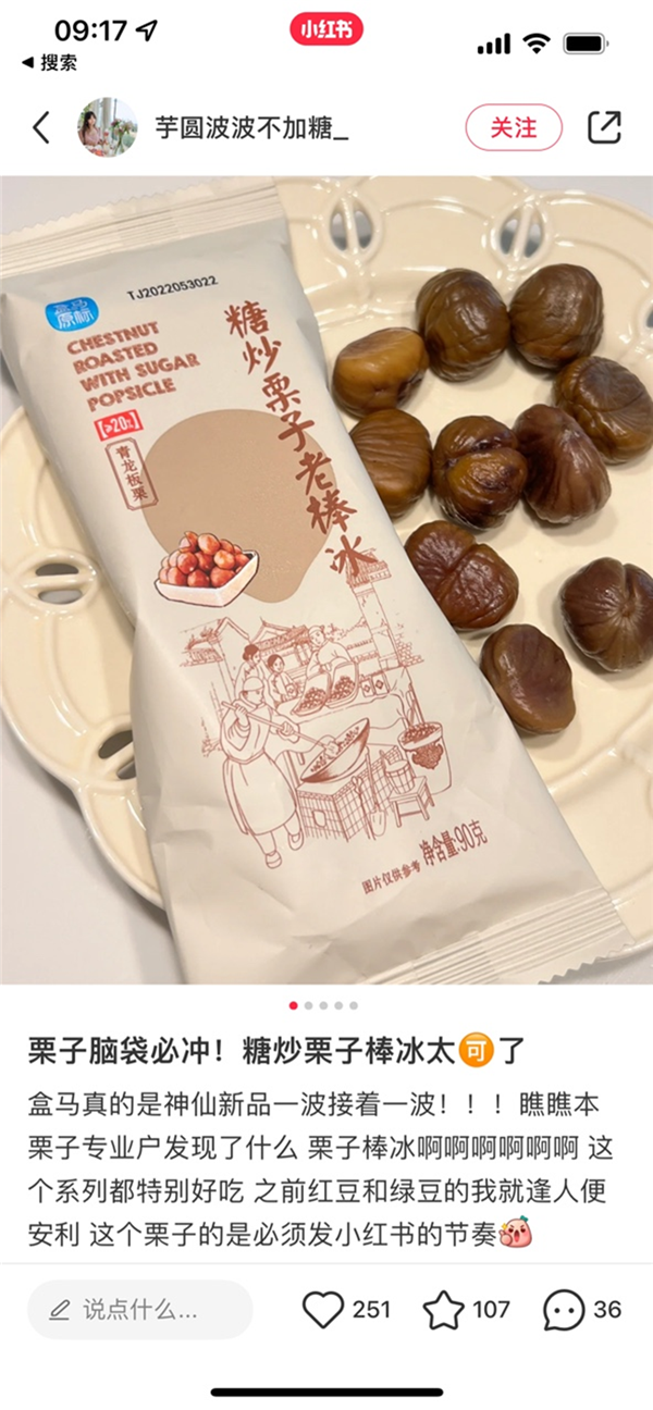 盒馬定牌採購經理朱培説,“在調研中我們發現,很多板栗在加工過程中果肉裂開、不完整,就沒辦法上市,但果肉還是很優質的,把這些果肉破碎成丁,做成糖炒栗子老棒冰,新品上市的同時,也大規模減少了損耗。