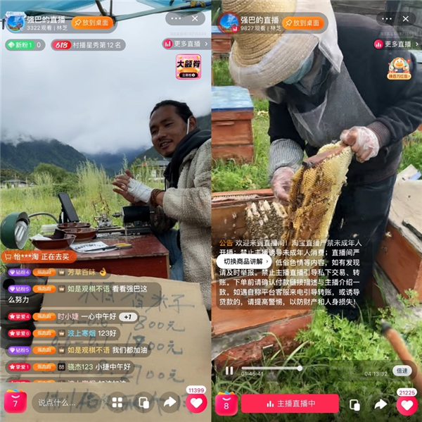 而遠在青藏高原,淘寶主播藏族大姐扎西卓瑪、藏族小哥強巴等同樣在開播。在強巴的直播間,可以看到背景就是林芝壯美的自然風光,有時他還會開車帶大家去到蜂農家中直擊採蜜現場,現場直播採蜜、搖蜜、裝蜜的全過程。