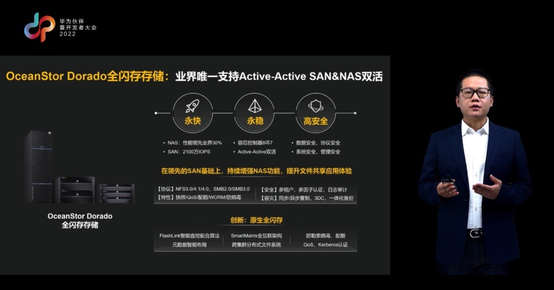 唐浩介紹稱,“華為OceanStor Dorado全閃存已經廣泛服務於各行業的核心生產應用,樹立了高可靠和高性能的業界口碑,華為OceanStor Dorado全閃存存儲基於原生全閃存架構,包含大量創新。例如:為了滿足極致的業務可靠性訴求,採用獨特的SmartMatrix全互聯架構,通過硬件全互聯和部件全冗餘,將故障域降至最低。同時華為OceanStor Dorado全閃存採用獨創的FlashLink智能算法,充分發揮閃存性能,做到了高達2100萬SPC-1 IOPS以及0.05ms極致低時延,可以説是業界最快的全閃存存儲。如今,全新一代OceanStor Dorado,在領先的SAN基礎上,持續增強NAS能力。以防勒索、WORM為代表的豐富安全特性,實現文件跨部門安全共享。業界唯一支持AA架構SAN/NAS一體化雙活,保障業務持續在線。”