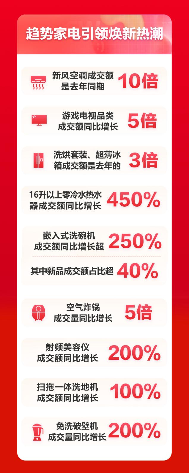 另一方面在多元消費趨勢的帶動下,能滿足消費者個性化需求,具備潮酷、新奇、健康、智能等功能屬性的趨勢家電日益受到用户歡迎,併成為市場發展的突破口。京東618期間數據顯示,遊戲電視成交額同比增長5倍;洗烘套裝和超薄冰箱成交額是去年的3倍;新風空調成交額是去年10倍;16升以上零冷水熱水器成交額同比增長450%;嵌入式洗碗機成交額同比增長超250%,其中新品成交額佔比超40%;空氣炸鍋成交量同比增長5倍;射頻美容儀成交額同比增長200%;掃拖一體洗地機成交額增長100%;免洗破壁機成交量同比增長200%。