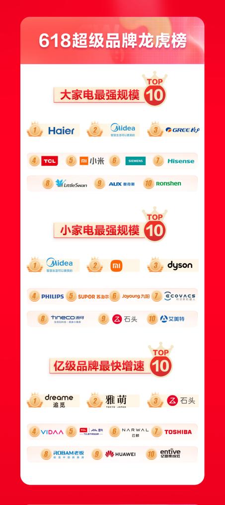 京東618期間,眾多品牌廠商投入海量資源為消費者帶來高品質家電好物,同時廠商之間的競速排名也空前激烈。根據數據顯示,海爾、美的、格力成為京東618期間大家電成交額TOP3品牌。美的、米家、戴森成為小家電成交額TOP3品牌。此外,追覓、雅萌、石頭則成為億元級品牌在618期間增速的前三品牌。