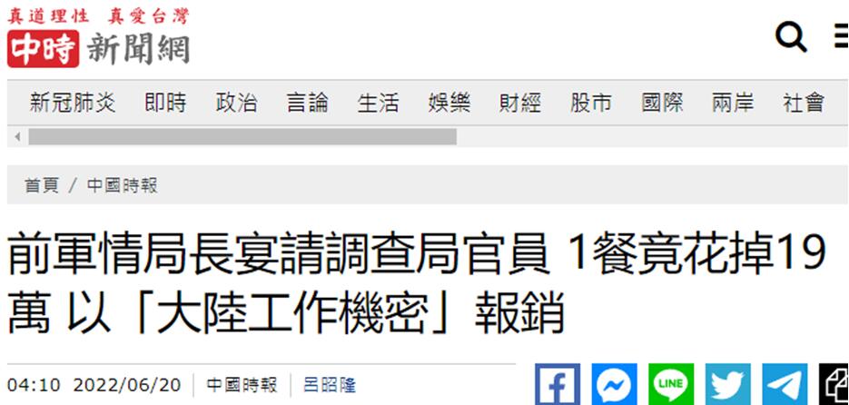 “中時新聞網”報道稱,對於台“軍情局”與“調查局”高層吃飯花掉19萬元,而且是用“大陸工作機密”項目報銷,外界看法不一。有人認為,“軍情局”和“調查局”有工作交集,彼此“密切合作聯誼”是應該的。反對者則強調,一頓飯吃了19萬,而且兩個都是公家機關,過於誇張,傳出來確實不太好聽。