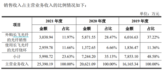 不僅如此,根據長盈通此前發佈的《第二輪審核問詢函的回覆》,其中第11頁披露了發行人外購長飛光纖的特種光纖直接銷售和使用其繞制的光纖環銷售收入佔主營業務收入的比例情況,能夠看到長盈通從長飛光纖採購來的光纖材料,直接對外銷售的比例遠遠超過了以其作為原材料加工成光纖環後對外銷售的比例,2020年直接對外銷售收入金額相當於以其作為原材料加工後收入的3倍以上。而與此同時,長盈通在2020年向長飛光纖採購金額僅為3131.69萬元,這對應着通過轉賣長飛光纖的產品成品,長盈通就能夠獲得翻倍的利潤。