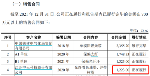 招股書披露的重大合同相關信息還顯示,公司在2020年與“江蘇中天科技股份有限公司”簽訂光纖着色油墨、並帶樹脂銷售合同,金額為1223萬元;但與此同時,“江蘇中天科技股份有限公司”作為長盈通2020年和2021年的第五大客户,公司向其銷售塗覆材料金額分別為867.54萬元和800.08萬元,合計已高達1600萬元以上,顯著超過了公司與該客户簽訂的合同金額。