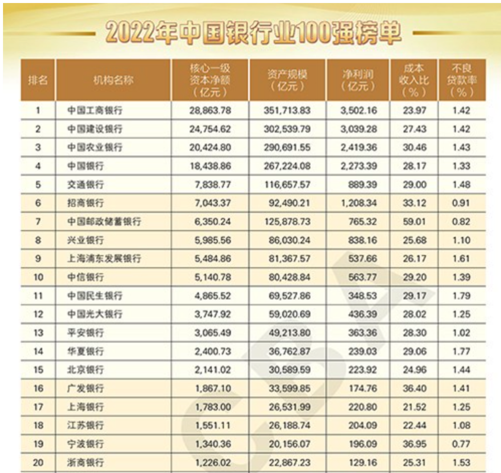 榜單按核心一級資本淨額排序,前十位的銀行依次為:工商銀行、建設銀行、農業銀行、中國銀行、交通銀行、招商銀行、郵儲銀行、興業銀行、浦發銀行、中信銀行。