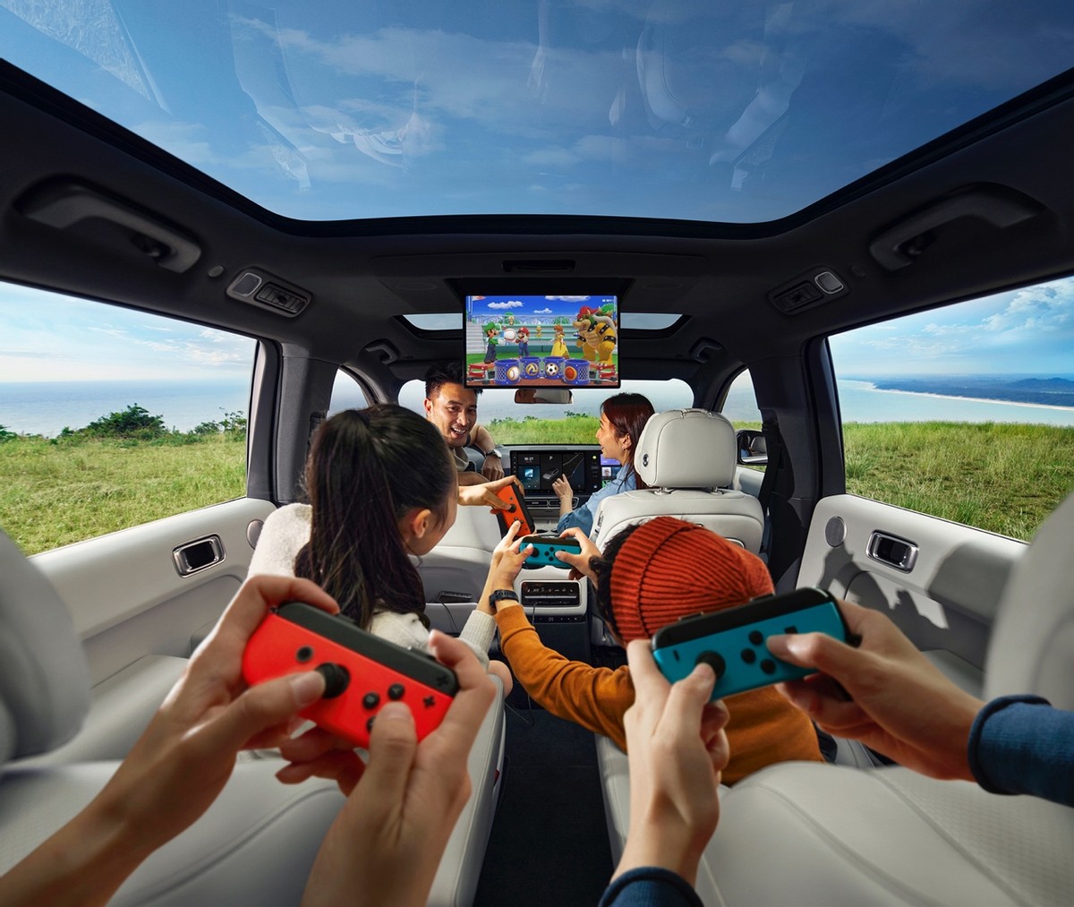 理想L9通過Type-C接口可實現Switch一根線的直連投屏及60瓦供電需求,可以輕鬆支持四個人一起遊戲。此外,理想L9還在車內配備了220伏電源,搭配HDMI-Type-C的轉接線,各種頂級的遊戲機和3A大作均可以在車內暢玩。