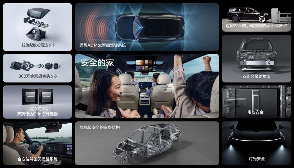 如果説車身的結構決定了安全的底線,那麼智能駕駛將決定安全的上限。理想汽車持續堅持智能駕駛全棧自研,始終將安全作為最首要的目標。理想L9將標配旗艦級的理想AD Max智能駕駛系統,具備強大的感知能力和數據處理能力。在感知能力上,理想AD Max配備了1顆前向128線激光雷達,6顆800萬像素攝像頭和5顆200萬像素攝像頭,以及1顆前向毫米波雷達和12顆超聲波傳感器,真正實現對車身周圍及遠距離的360°全方位感知。通過強大的融合感知系統,讓車輛看得更遠、看得更廣、也看得更清晰,從而更有效地幫助駕駛者識別風險,大大提升了駕駛的安全性。此外,理想L9通過車內3D ToF傳感器和車外攝像頭,提供同時覆蓋車內車外的哨兵模式。