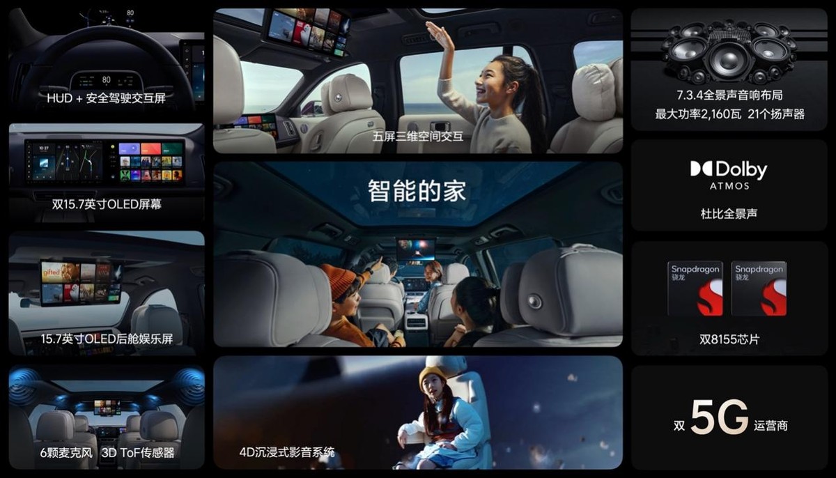 理想L9的智能座艙,採用了兩顆高通驍龍8155車規級芯片,保障了五屏三維交互的流暢性和響應速度。車載網絡通信採用5G雙運營商,確保高速網絡的即時在線,在車內觀看高清在線視頻時不會出現任何卡頓。同時,還將通過空間商店,為用户帶來更豐富的智能應用和智能配件。