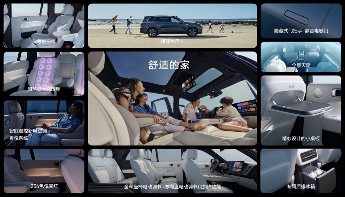 理想L9標配了超大的雙全景天幕和電動遮陽簾,提供極佳的隔熱效果。全新的四座小憩模式,可以瞬間將車變成一個舒適的家。伴隨着智能温控新風空調、香氛系統以及256色氛圍燈,為每一位家人創造温馨健康的車內環境。在靜謐性方面,理想L9的四個車門和尾門都採用了靜音電吸門,前風擋、雙全景天幕、一排和二排車窗均採用雙層隔音隔熱玻璃,讓一家人的旅途更加舒適安靜。