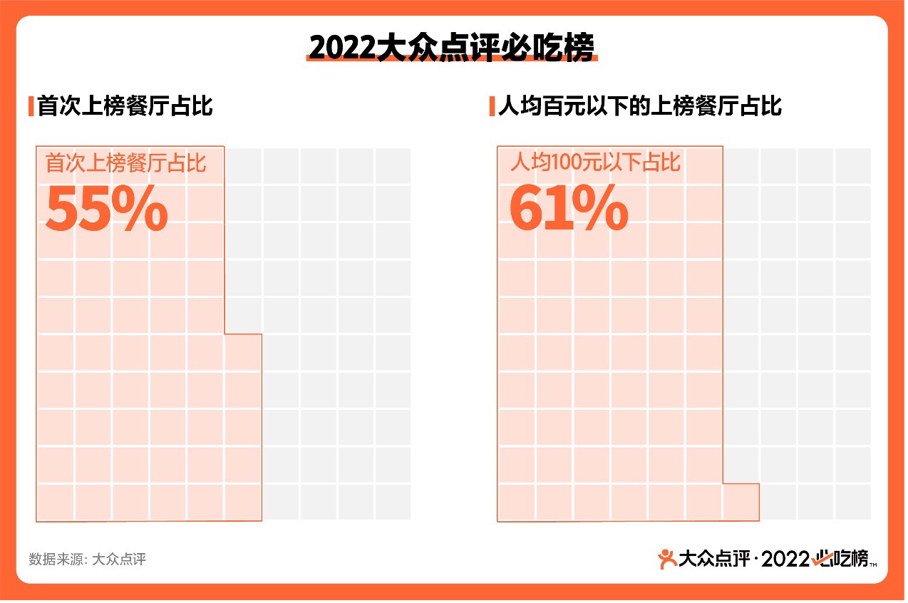 圍繞“好吃不貴體驗佳”的原則,2022年“必吃榜”從大眾點評1400多萬商户中遴選“消費者真覺得好吃”的餐廳——上榜餐廳平均星級4.7分,人均價格103元。得益於二三四線城市日益強勁的餐飲消費力,2022年“必吃榜”進一步擴大覆蓋面,在去年基礎上,新增桂林、泉州、惠州、樂山、台州、順德等內地9城。