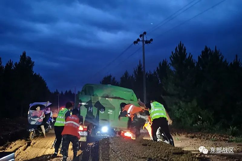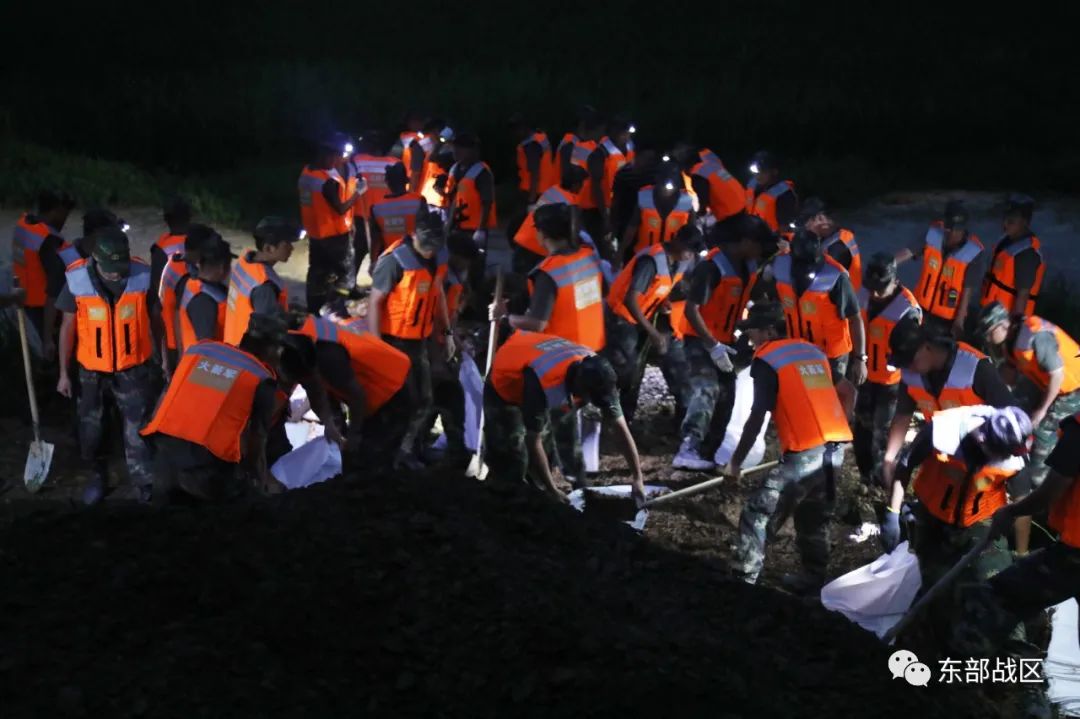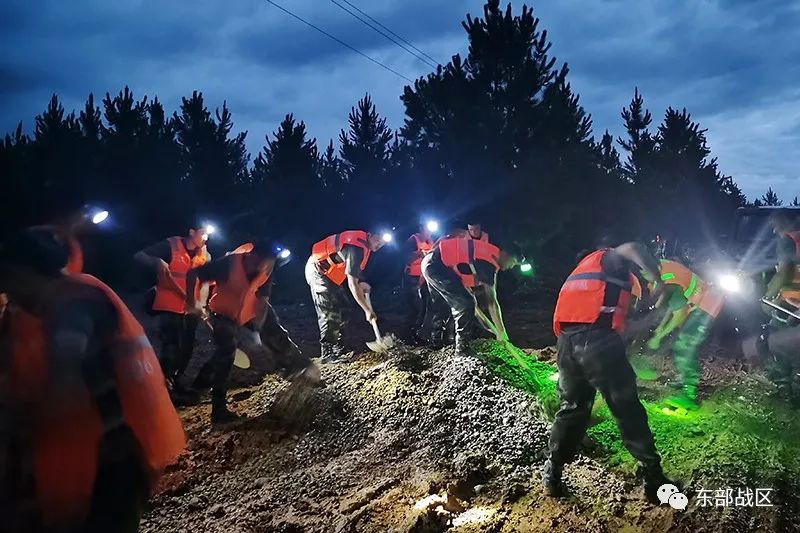 一羣“導彈綠”打着探燈搬運、堆垛沙袋