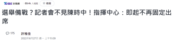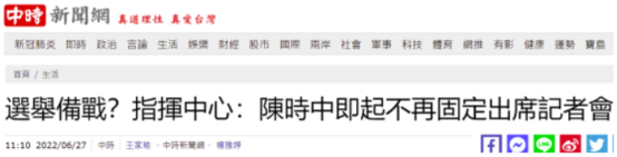 中時新聞網也稱,針對參選台北市長一事,陳時中的回答一直以來都是避重就輕。如今,指揮中心卻公佈,今日起有重大政策發佈陳時中才會主持記者會,令人不禁聯想陳時中將“披綠袍戰台北市”。