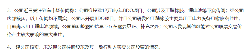 【環球網綜合訊】6月28日消息,神馬電力昨日晚間發佈股票交易異常波動暨風險提示公告。公司表示,近日關注到有市場傳聞稱:公司擬投建12萬噸/年BDO項目、公司涉及丁腈橡膠、鋰電池等不實傳聞;經公司內部核實,以上傳聞均不屬實,公司未開展BDO項目,並且公司研發的丁腈橡膠主要是用於電力設備用橡膠密封件,目前尚未用於鋰電池領域。