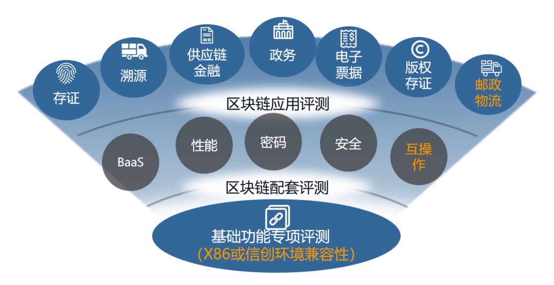 工信部中國信通院於2017年推出“可信區塊鏈系列評測”,已成為國內外首個全面覆蓋區塊鏈技術、應用一體化的評測體系,是國內走在前列、最具代表性的區塊鏈產品評測體系。基於“可信區塊鏈評測”體系,中國信通院累計對200餘款產品、完成270餘次專項測試,形成區塊鏈測試評估相關的國際國內標準規範20餘項,並形成涵蓋基礎功能、性能、安全、密碼、互操作、BaaS,以及政務應用、存證應用、供應鏈金融、溯源應用、電子票據、版權存證等10多個應用類項目的評測體系。