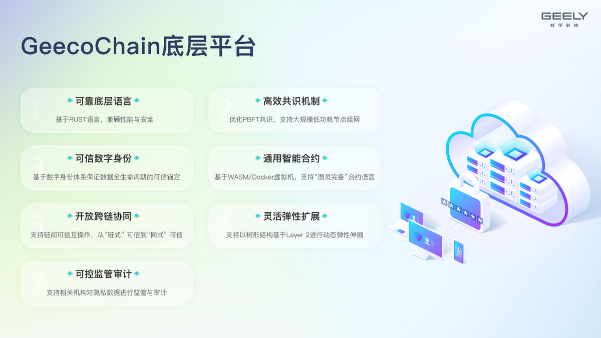 吉利數科區塊鏈底層平台GeecoChain由吉利數科自主研發,支持可信數字身份及多維度隱私保護機制,實現鏈間數據可信互通,兼顧性能與安全,並積極擁抱監管,從而為企業提供信任基礎設施保障。目前,GeecoChain已為吉利數科自研的吉溯雲區塊鏈溯源管理平台、企業級區塊鏈服務平台GeeBaaS等區塊鏈解決方案提供底層技術支持。